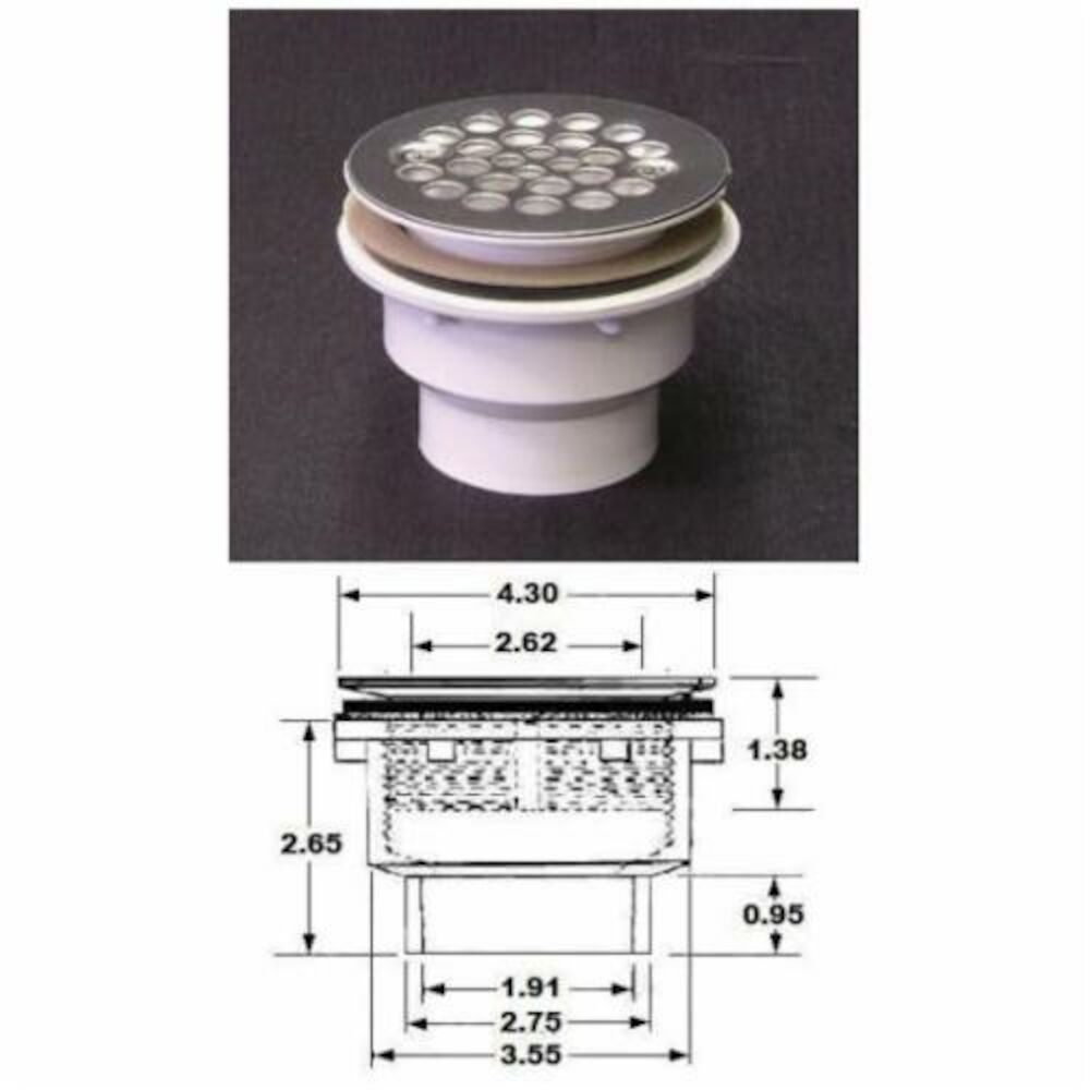PFG600 Shower Drain w/ Stamped Stainless Steel Strainer, Fiberglass Drain