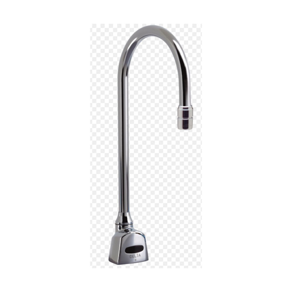 - DELTA® Electronic Basin Faucet, Series: 1500T3, 1.5 gpm, Gooseneck Spout, 6 in Spout Reach, 7.3 in Spout Height, 1 Faucet Hole, 3/8 in, Compression, Spray Pattern: Laminar, Function: Touchless, 2-1/2 in Maximum Deck Thickness, Deck Mount, Solenoid Valve Valve/Cartridge, Brass, Chrome Plated, Import, Commercial